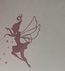 2018Muurschildering voor kleindochter op wittemuur met acrylverf. Bloem van vlinders die weg waaieren